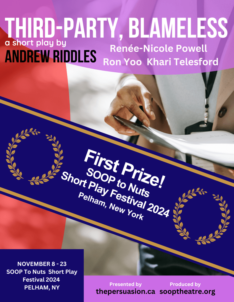 Winning first prize in this Fall’s SOOP to Nuts Short Play Festival 2024, The Persuasion’s presents Third-Party, Blameless by Andrew Riddles.